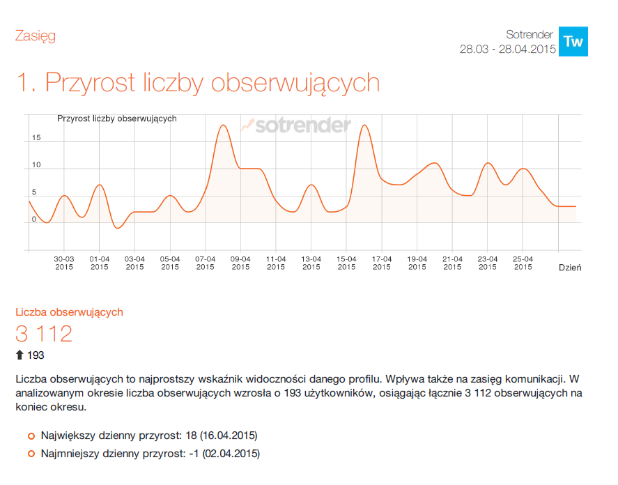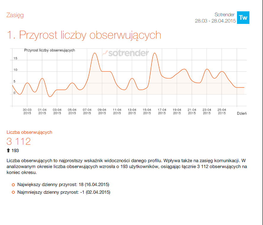 Nigdy więcej nieczytelnych wykresów i setek niezrozumiałych liczb. Automatyczne raporty dla Twittera w Sotrenderze są bardziej przejrzyste. Ich profesjonalny wygląd wystarcza, by zrobić szybki zrzut ekranu i od razu wstawić go do biznesowej prezentacji. Kolory są jasne i bardziej przyjazne. Raporty zorganizowane są w rozdziałach – każdy z nich zawiera podsumowanie różnych aspektów aktywności na Twitterze.