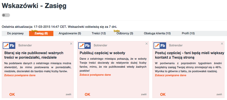 W marcu dodaliśmy do narzędzia nowy zestaw wskazówek optymalizacyjnych dla Facebooka, tym razem opartych na danych z Facebook Insights. Sprawdzicie dzięki nim, jakie są możliwe przyczyny słabego zasięgu Waszych postów oraz dowiecie się, jak możecie go poprawić. Dodatkowo wskazówki w jeszcze większym stopniu uwzględniają grupy demograficzne. Biorąc pod uwagę konkretne grupy odbiorców, pozwalają na bardziej precyzyjne dostosowanie treści do grupy docelowej. Zachęcamy do korzystania ze wskazówek, ponieważ jak pokazują nasze analizy, regularne ich stosowanie pozwala na poprawę wyników stron aż o blisko 30%!