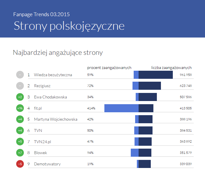 Najpopularniejszym postem marca był film opublikowany przez fit.pl, który osiągnął zadziwiający (i godny pozazdroszczenia) Interactivity Index wynoszący 1, 8 mln. Dzięki temu strona poszybowała w rankingach zaangażowania i interaktywności. W pierwszym z nich zanotowała awans o 9 tys. (słownie: dziewięć tysięcy) miejsc i znalazła się na czwartej pozycji, angażując 413, 5 tys. użytkowników, czyli 414% swoich fanów (tak wysoki procent wynika z faktu, że Facebook umożliwia interakcje również użytkownikom niebędącym fanami danej strony). W rankingu interaktywności Fit.pl awansował o 1008 miejsc i otwiera to zestawienie.