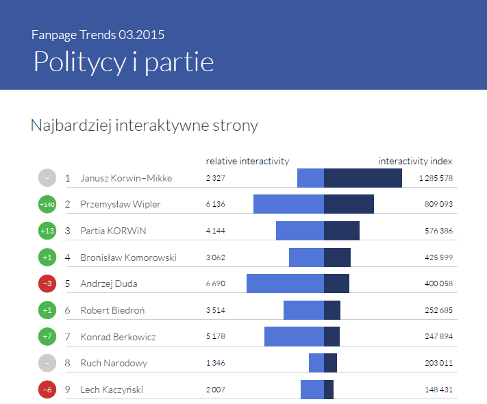 Mimo wspomnianych już porządków, strony z kategorii Polityka i Partie w marcu raczej zyskiwały fanów niż ich traciły. Liczba fanów spadła tylko w przypadku sześciu z piętnastu największych profili w kategorii. Najwięcej nowych polubień otrzymał profil Andrzeja Dudy – w ubiegłym miesiącu polubiło go ponad 20 tys. użytkowników. Wśród kandydatów na prezydenta prym wiedzie, jak można się domyślać, Janusz Korwin-Mikke, jednak najlepszy post w kategorii nie był jego autorstwa. Palma pierwszeństwa przypadła w tym przypadku Przemysławowi Wiplerowi, innemu działaczowi Partii KORWiN. Formacja obu polityków pnie się w górę w rankingu największych stron i zbliża się już do podium. Co ciekawe, przybywa jej fanów mimo prawie całkowitego braku interakcji z użytkownikami – z 625 postów na stronę odpowiedzi doczekało się jedynie sześć. Nad tym aspektem obecności w mediach społecznościowych zdecydowanie warto popracować. W zestawieniu zaangażowania możemy zauważyć spore zmiany i dominację polityków związanych z Partią KORWiN. W najlepszej piętnastce znalazło się ich aż czworo (oprócz Przemysława Wiplera i Janusza Korwin-Mikkego – Konrad Berkowicz oraz Agata Banasik). Już niedługo na naszym blogu ukaże się pierwsza z serii analiz dotyczących obecności kandydatów do objęcia urzędu głowy państwa w mediach społecznościowych.