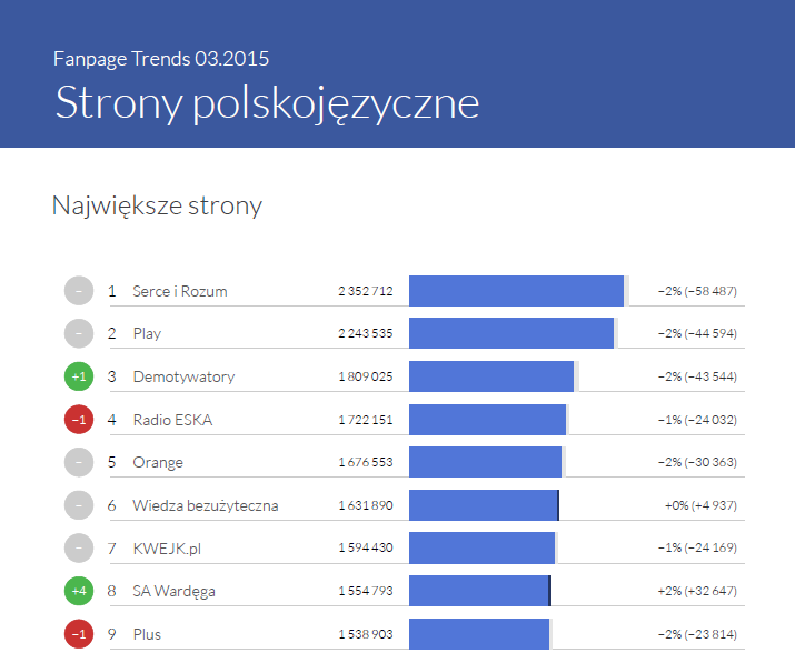Usuwanie polubień pochodzących z nieaktywnych kont, które rozpoczęło się 12 marca wpłynęło na popularność także polskich stron. Najwięcej “lajków” straciły strony z kategorii muzyka – ponad 600 tys. Jednak ta branża utrzymała swoją pozycję w rankingu. Blogi, zyskując ponad 86 tys. fanów, awansowały o jedno miejsce. Wśród dziesięciu największych stron na Facebooku wzrost liczby fanów zanotowały tylko profile SA Wardęgi i Wiedzy bezużytecznej Średnio polskie strony na Facebooku w wyniku wiosennych porządków straciły po 289 fanów, z kolei ponad połowie analizowanych profili ubyło po 25 fanów. Jedna czwarta wszystkich analizowanych stron straciła po ponad 165 fanów. Więcej na ten temat przeczytacie na naszym blogu we wpisie – Spadek liczby fanów stron na Facebooku – ile lajków straciła Twoja strona?
