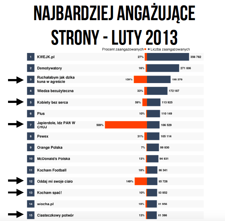Jak wspomniałam, na Facebooku działo się wówczas różnie, co doskonale obrazuje zestawienie najbardziej angażujących stron z lutego 2013.