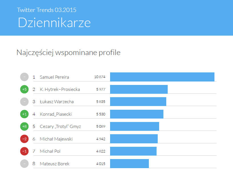 Pokłosiem zwiększonej aktywności ubiegających się o urząd prezydenta jest większe ożywienie wśród dziennikarzy zajmujących się polityką. Tweetowali częściej, częściej także wdawali się w dyskusje z innymi użytkownikami, co przełożyło się na zmiany w rankingach. W marcu dziennikarze polityczni zajęli piewsze pięć miejsc w rankingach najbardziej angażujących profili. Duży awans zanotował profil Cezarego Gmyza, jednak jest to częściowo efekt jego tweetów na temat katastrofy samolotu GermanWings.