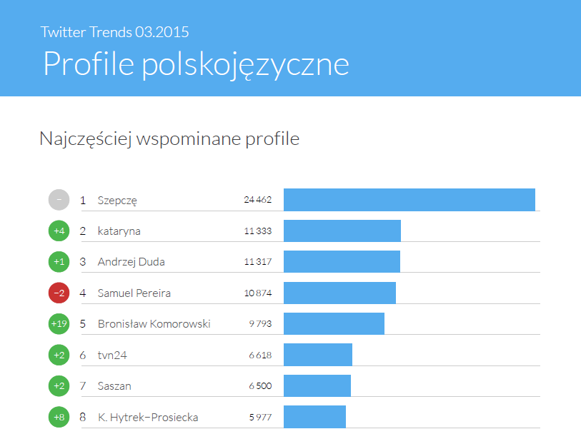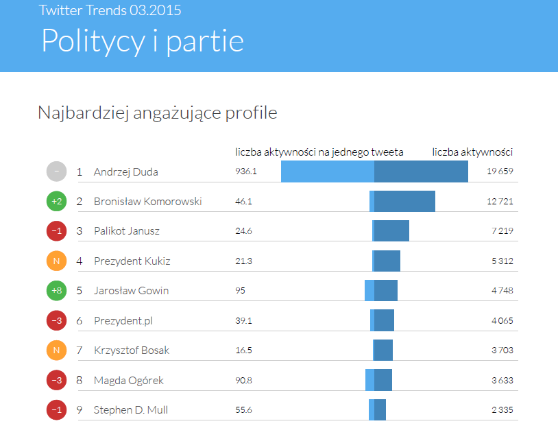 Na dwa miesiące przed wyborami, kandydaci do najważniejszego urzędu w państwie intensyfikują komunikację. Profil Bronisława Komorowskiego zanotował awans o 33 miejsca w rankingu najbardziej angażujących profili na polskim Twitterze, jednak nadal przegrywa w tej kategorii z profilem kandydata Prawa i Sprawiedliwości – Andrzeja Dudy. Kandydat Duda postanowił zaktywizować użytkowników Twittera, organizując Tweet Up, co z pewnością miało wpływ na jego wysokie pozycje w rankingach najczęściej wspominanych profili. Skutecznie z Twittera korzysta również Paweł Kukiz, w rankingu najbardziej angażujących profili politycznych w marcu uplasował się zaraz za podium. Jeszcze w tym tygodniu na naszym blogu opublikujemy bardziej szczegółową analizę aktywności kandydatów w mediach społecznościowych.