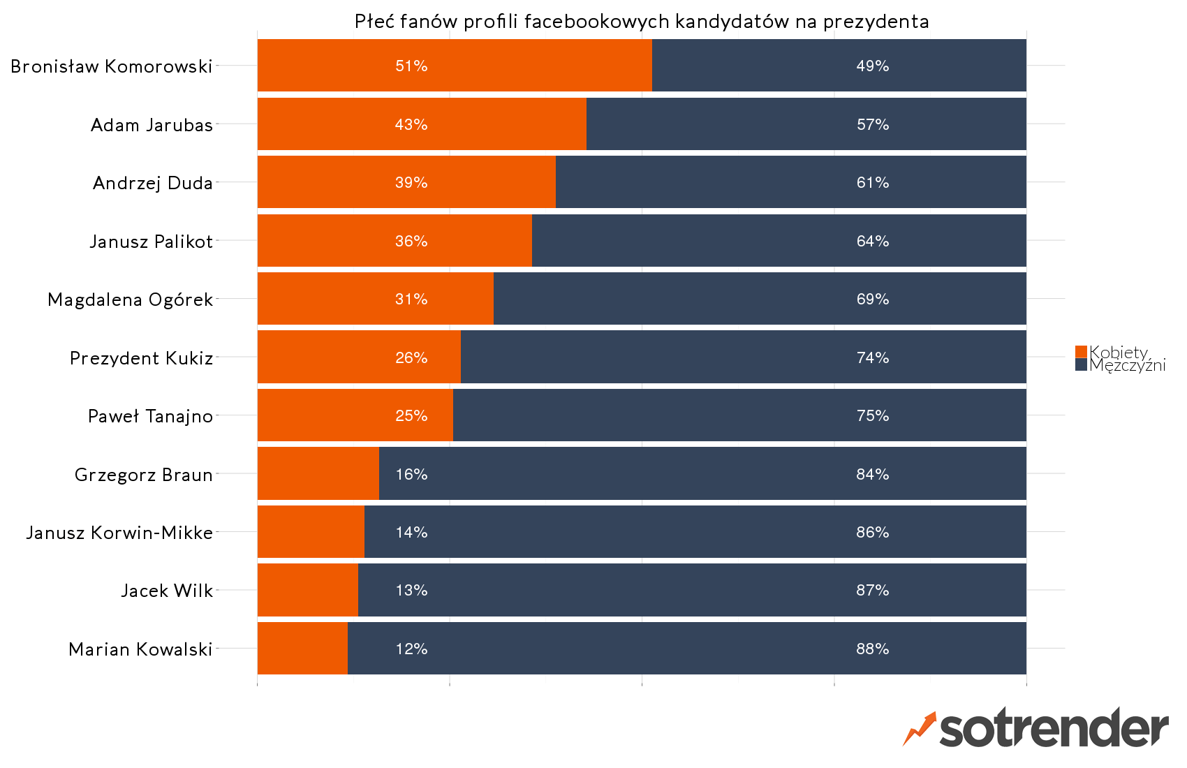 Wysoki odsetek kobiet możemy również zauważyć na profilu Adama Jarubasa, kandydata Polskiego Stronnictwa Ludowego. Najbardziej zmaskulinizowanym profilem jest strona Mariana Kowalskiego, lidera Ruchu Narodowego. Jest to zmiana w stosunku do 16 kwietnia. Wtedy najbardziej męską strukturę fanów miał Jacek Wilk, kandydat Kongresu Nowej Prawicy.