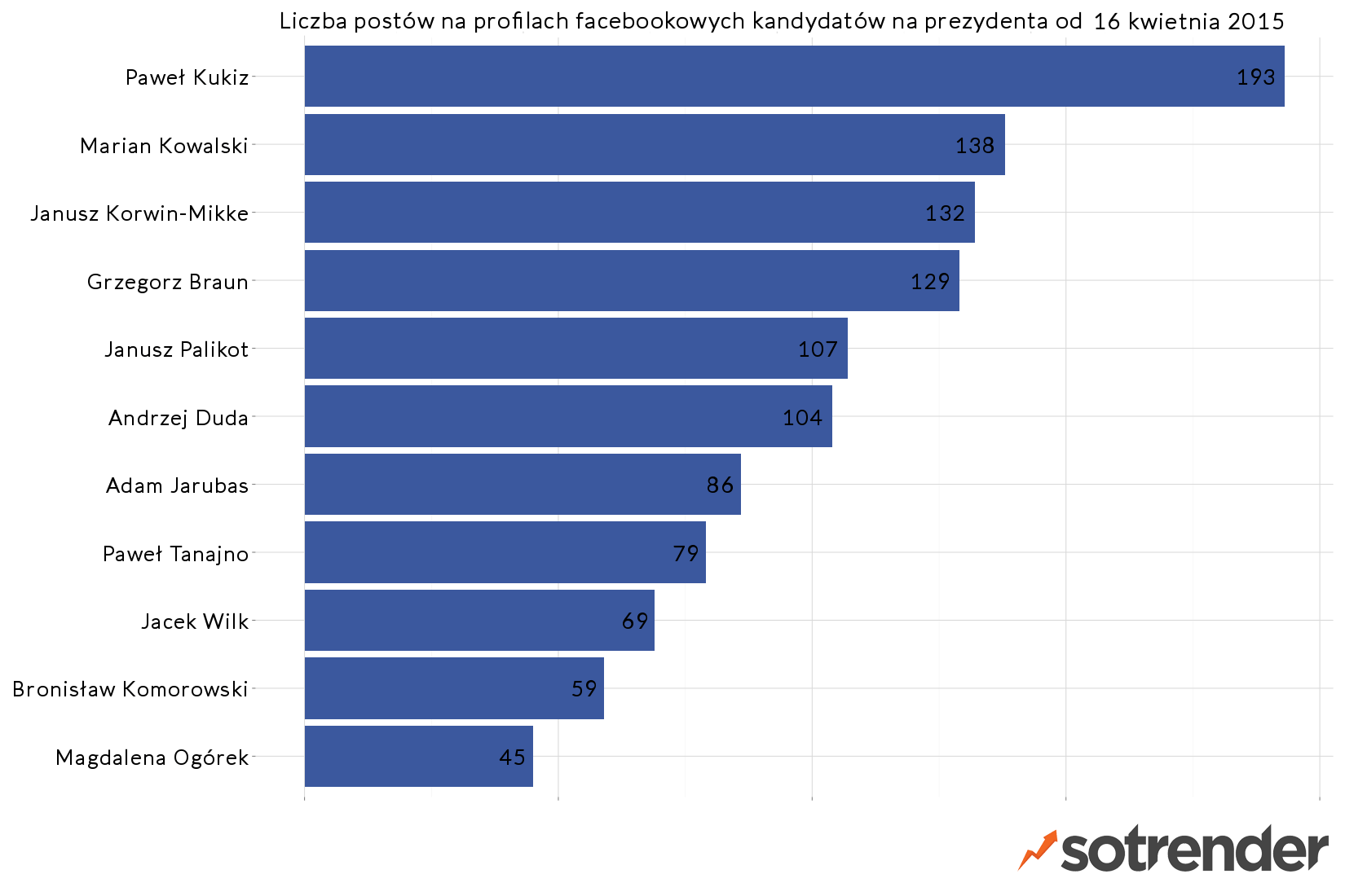 Janusz Korwin-Mikke, niepodzielny władca polskiego politycznego Facebooka przekroczył kolejną symboliczną barierę. Jego fanpage polubiło ponad 600 tys. osób, a od 16. kwietnia jego strona zyskała ponad 50 tys. fanów. Profil Pawła Kukiza dołączył do stron mających ponad 100 tys. fanów, a do tej liczby w dniu 6. maja zbliża się fanpage Andrzeja Dudy i dziś też już ją przekroczył. Bardzo wolno w porównaniu do najsilniejszych konkurentów rośnie liczba fanów Bronisława Komorowskiego, w porównaniu do 16. kwietnia jego strona ma jedynie o 3 tys. fanów więcej. Strona Pawła Tanajno, kandydata Demokracji Bezpośredniej wzrosła o prawie 100%, jednak w wartościach bezwzględnych Tanajno plasuje się na końcu rankingów, mając ponad 2 tys. fanów.