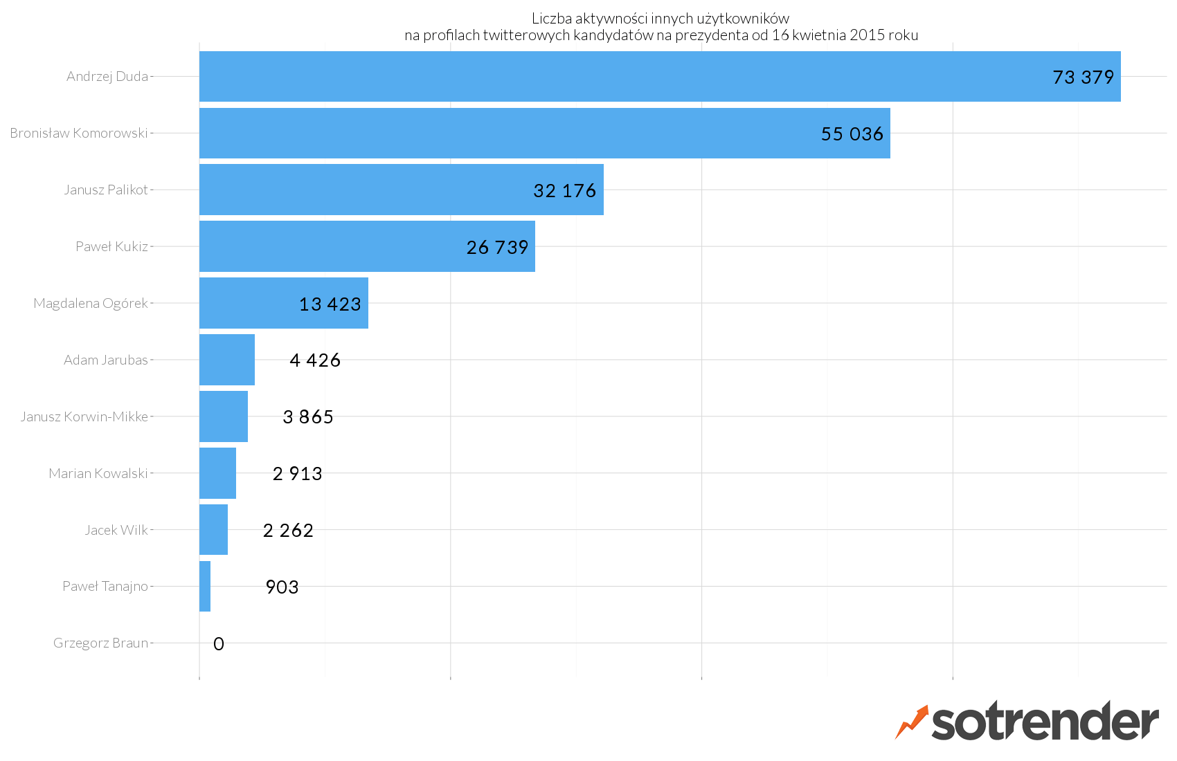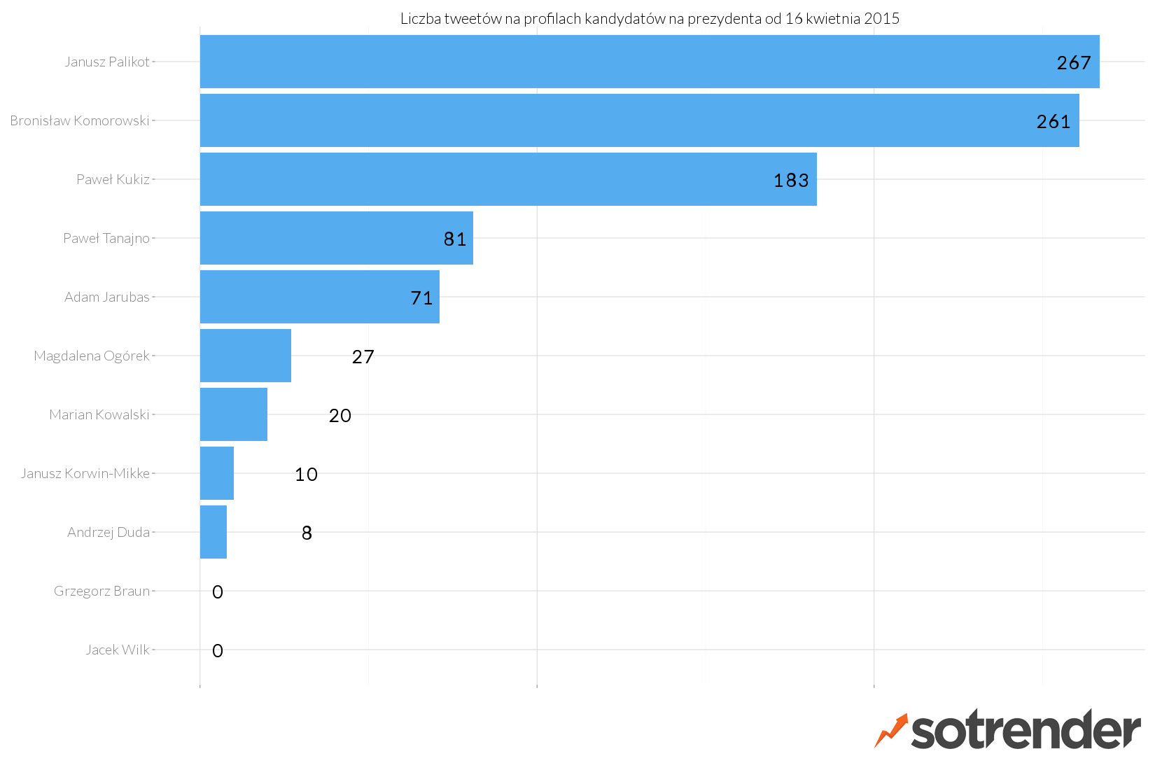 Najpopularniejszym i najaktywniejszym na Twitterze kandydatem na najwyższy urząd w państwie pozostaje lider Twojego Ruchu, Janusz Palikot, będący jednocześnie najczęściej obserwowanym polskim politykiem wg raportów Twitter Trends – cyklicznych raportów przygotowywanych przez Sotrendera. Jednak, mimo że tweetuje najczęściej, jego ćwierknięcia nie są tak szeroko komentowane, jak treści wysłane przez Andrzeja Dudę. Kandydat Prawa i Sprawiedliwości od 16. kwietnia wysłał tylko 8 tweetów natywnych (tweetów niebędących odpowiedziami na inne ćwierknięcia oraz podaniami dalej), jednak jego profil wywołuje najwięcej aktywności użytkowników Twittera. Również dlatego, że Andrzej Duda często podaje dalej treści innych twitterowiczów oraz odpowiada na ćwierknięcia.