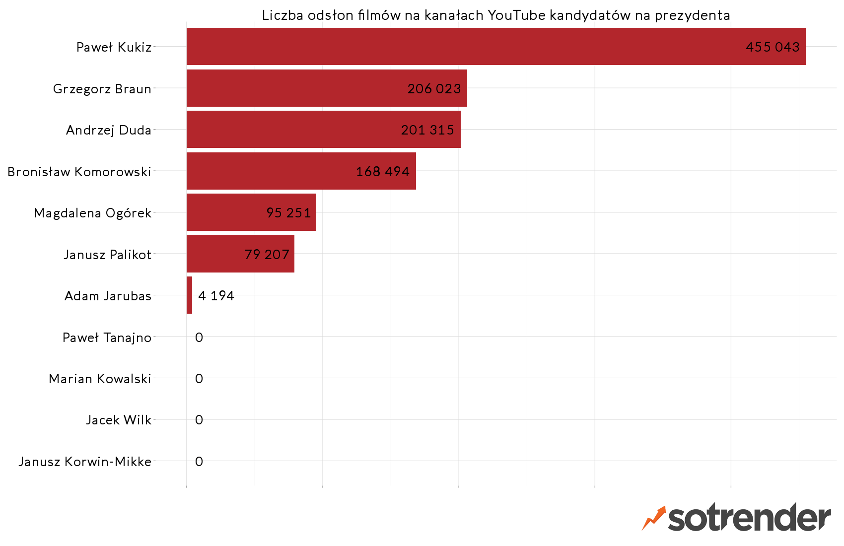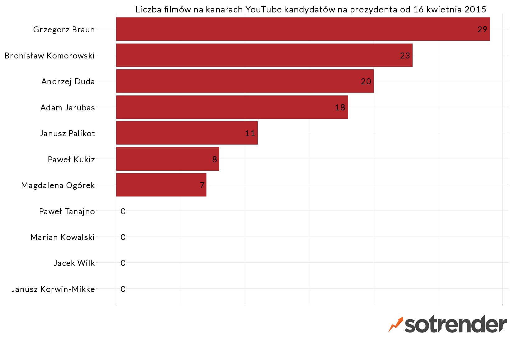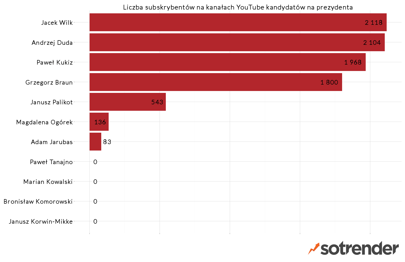 Lider partii KORWiN nie jest jedynym kandydatem bez oficjalnego kanału na YouTube – nie posiadają go również Marian Kowalski i Paweł Tanajno. Z kolei Bronisław Komorowski ujawnia liczby swoich subskrybentów, dlatego też mimo iż posiada swój oficjalny kanał, który niewątpliwie gromadzi liczne grono widzów, na poniższym wykresie obok jego nazwiska figuruje cyfra 0.