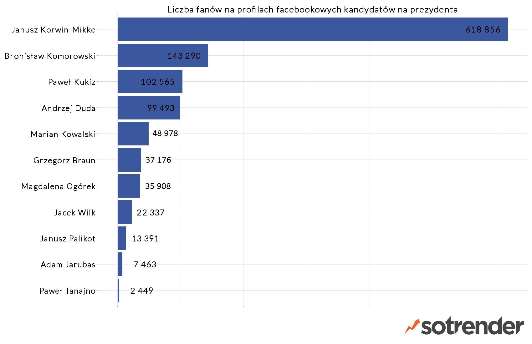 Janusz Korwin-Mikke jest także najbardziej angażującym kandydatem na Facebooku (jest również najbardziej angażującym polskim politykiem w serwisie według raportów Fanpage Trends – comiesięcznych raportów Sotrendera podsumowujących najważniejsze wydarzenia na Facebooku w Polsce), w badanym okresie treści publikowane przez lidera partii KORWiN zaangażowały ponad 380 tys. użytkowników serwisu, ponad 3 razy więcej niż drugiego w tym zestawieniu Pawła Kukiza. Należy jednak zaznaczyć, że Paweł Kukiz zaangażował więcej użytkowników niż jego profil ma fanów. Może być to związane z bardzo dużą aktywnością eks-muzyka, w badanym okresie komunikował się ponad trzystukrotnie.