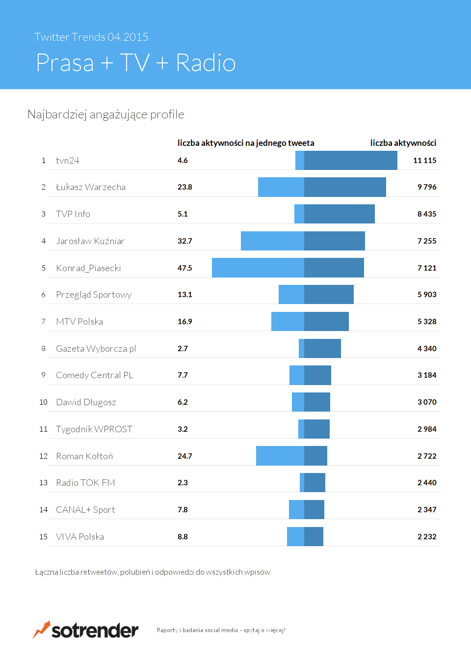 Więcej informacji na temat mediów tradycyjnych w social media oraz m.in. czas korzystania z różnych rodzajów mediów przez różne grupy demograficzne znajdziecie w prezentacji. Zachęcam również do darmowego przetestowania Sotrendera, narzędzia analizującego działania w mediach społecznościowych. Z naszych usług korzysta już wielu wydawców, m.in. koncern medialny Agora.