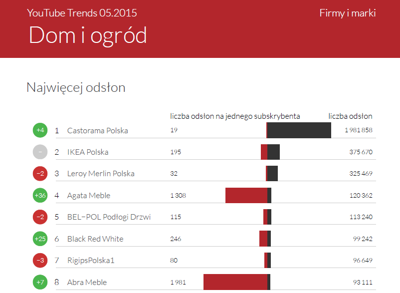 Maj to czas pierwszych prac w przydomowych ogródkach, dlatego można było się spodziewać większego ruchu w kategorii Dom i Ogród. Dobrym wynikiem może pochwalić się kanał Castorama Polska, który w ubiegłym miesiącu zyskał ponad 10 tys. subskrybentów, co umocniło go na pozycji lidera w kategorii. Kanał Leroy Merlin Polska, drugi pod względem wielkości, subskrybuje ponad 10 razy mniej użytkowników YouTube. Castorama Polska to również najbardziej interaktywny kanał w kategorii Dom i Ogród. Dotychczasowy lider – kanał IKEA Polska spadł na miejsce czwarte. Wśród 10 najpopularniejszych filmów w kategorii również króluje Castorama Polska.