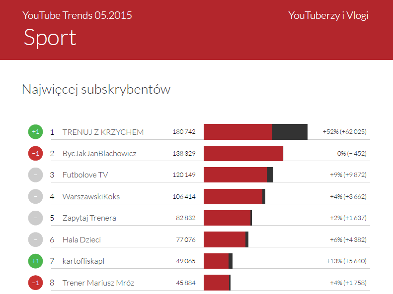 Kanały z największą liczbą subskrybentów w kategorii Vlogi sportowe -Sotrender YouTube Trends maj 2015