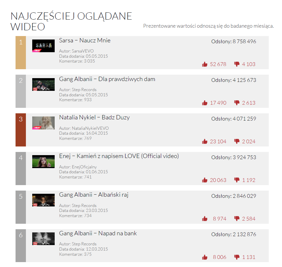 Najchętniej oglądanym wideo lipca był, podobnie jak w ubiegłym miesiącu, teledysk Sarsy. Na drugim miejscu znalazło się teledysk Gangu Albanii, który od miesięcy gości w czołówkach zestawień YouTube Trends, a na trzecim – teledysk innej uczestniczki programu The Voice of Poland – Natalii Nykiel.