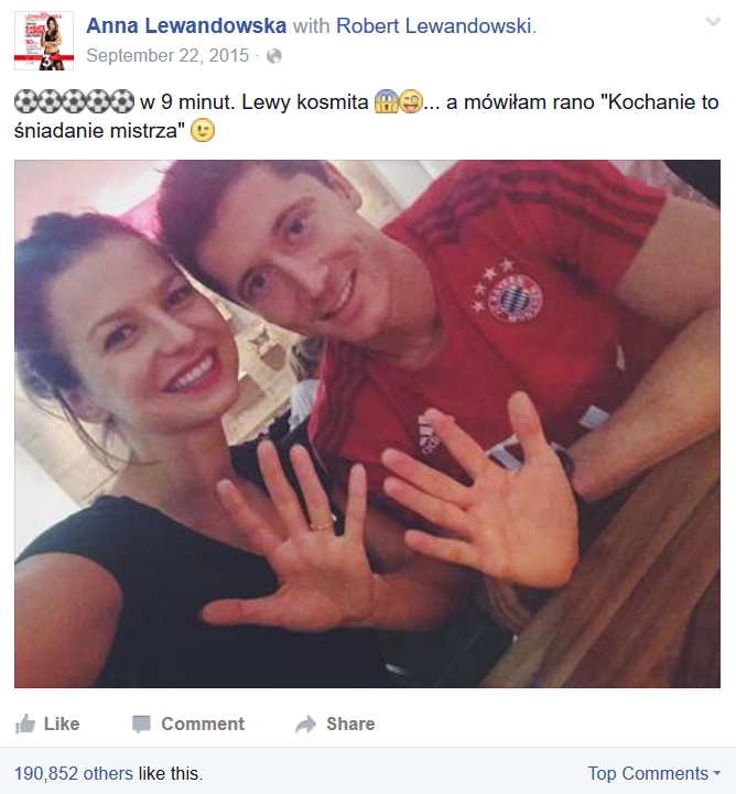 Niemal co miesiąc w Twitter Trends opisujemy sukcesy, które na społecznościowym boisku osiąga Robert Lewandowski. Niewątpliwie, gdyby piłkarz był uwzględniony także w Fanpage Trends, również rozbijałby bank aktywności. Przypomnijmy, w Fanpage Trends bierzemy pod uwagę polskie strony na Facebooku, czyli takie, które posiadają co najmniej 50% fanów pochodzących z Polski. Strona Roberta Lewandowskiego od bardzo dawna nie spełnia już tego kryterium. Inaczej jest w przypadku strony prowadzonej przez żonę piłkarza – Annę Lewandowską, dietetyczkę i trenerkę prowadzącą bloga Health plan by Ann. Ostatnie dokonania męża, potencjalnie spowodowane bezglutenową i beznabiałową dietą ułożoną właśnie przez Lewandowską, znalazły odzwierciedlenie we wrześniowym raporcie. Post, w którym Lewandowska gratuluje mężowi po zdobyciu 5 bramek w meczu z Wolfsburgiem był, jak nietrudno się domyślić, najbardziej lubianym postem miesiąca.