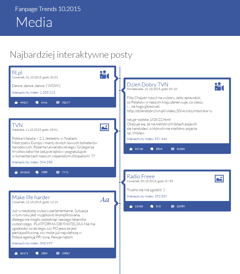 Podczas gdy Twitter aż dudnił od echa powyborczych emocji, patrząc na wyniki stron na Facebooku, można odnieść wrażenie, że w październiku nie odbyły się żadne wybory. Na Facebooku z okołowyborczej gorączki nie skorzystali sami politycy, a blogerzy z Make life harder, którzy zachwycili fanów swoim przesyconym ironią podsumowaniem przedwyborczych obietnic partii. Wpis Make life harder uplasował się na piątym miejscu pod względem interaktywności w kategorii media oraz został najbardziej interaktywnym postem wśród blogów. W efekcie fanpage Make life harder awansował o 45 pozycji w rankingu najbardziej angażujących stron blogów oraz aż o 86 miejsc w zestawieniu najbardziej interaktywnych profili. Wynik wyborów pozwolił się również wybić stronie Nie lubię PIS-u, która skoczyła o 24 miejsca w rankingu najbardziej angażujących stron polskojęzycznych.