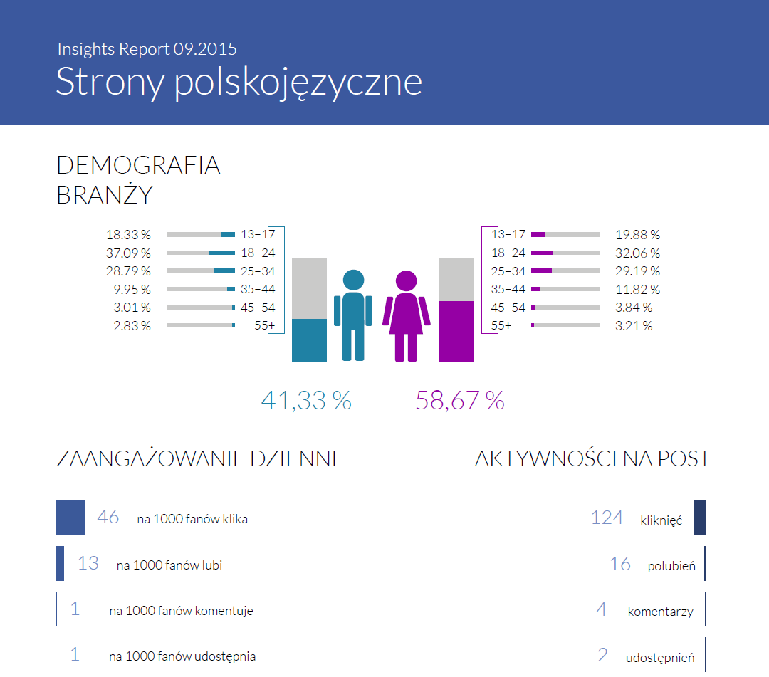 Dynamika zmian na Facebooku wymusza na administratorach stron elastyczne podejście do prowadzenia komunikacji, które powinno być wypadkową wielu zmiennych. Należą do nich oczywiście specyfika grupy docelowej oraz cel komunikacji, ale przede wszystkim – charakterystyka branży, w której operuje promowana przez nas marka. Aby zapewnić administratorom stron stały dostęp do najbardziej aktualnych danych na temat najbardziej angażujących branż, w październiku zapoczątkowaliśmy nowy cykl raportów – Insight Trends. W raporcie prezentujemy pogłębione statystyki dotyczące demografii, zasięgu, zaangażowania fanów oraz liczby aktywności na stronach należących do poszczególnych branż. Wiedza o średnich wartościach dla każdego ze wskaźników w danej branży pozwoli bardzo łatwo porównać wyniki danej strony z przeciętnymi wynikami innych stron z danego segmentu, by jeszcze skuteczniej ocenić jakość prowadzonej komunikacji.