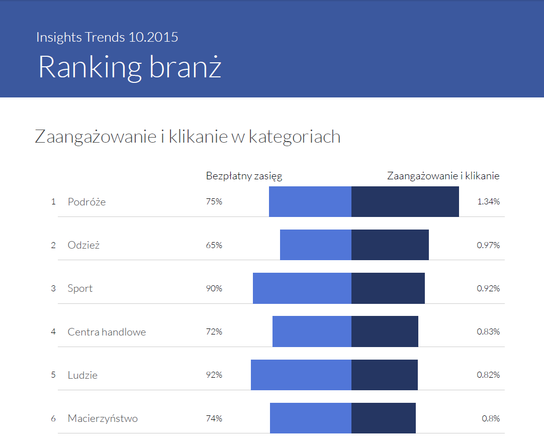 W związku z dodaniem nowych branż mamy nowego lidera w rankingu zaangażowania fanów. Najwięcej aktywności użytkowników Facebooka wywoływały posty Stron z branży Podróże. Nic dziwnego, idzie zima, lato zostało odległym wspomnieniem – czas zaplanować wyjazdy na narty i przyszłoroczne wakacje.