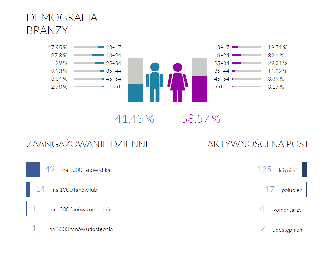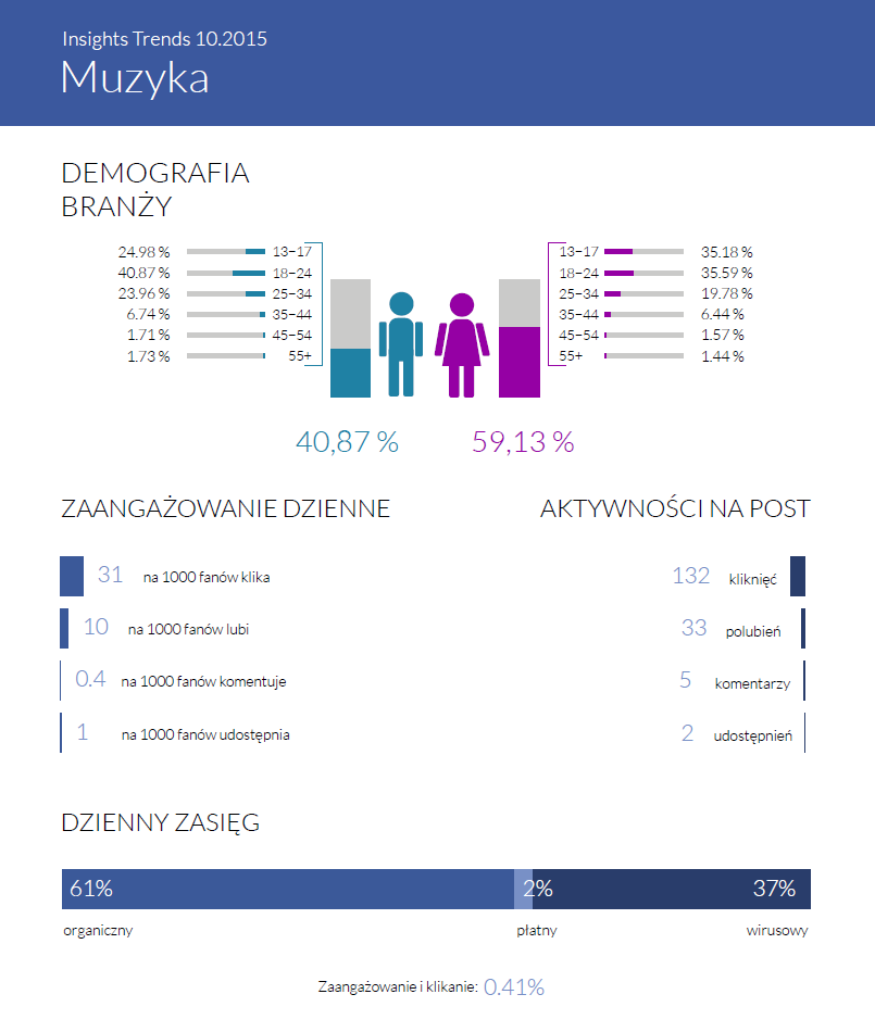 Co ciekawe, Blogi, branża opierająca swoją komunikację na interakcji z użytkownikami i zasięgach bezpłatnych, musiała ustąpić miejsca kategorii Muzyka, która swoją komunikację opiera na podobnych zasadach. Łączny zasięg bezpłatny (organiczny i wirusowy) w tej kategorii wyniósł 98%!