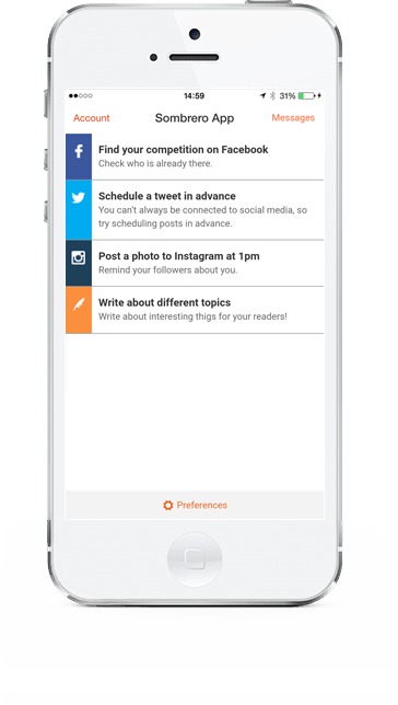 Sombrero jest dostępny na Androida i iOS (pracujemy również nad wersją na Windows Phone). Sercem aplikacji są codzienne zadania, wybrane na podstawie ankiety wypełnianej przez użytkownika. Zadania składają się z polecenia i instrukcji. Każde zadanie linkuje do specjalnego wpisu na blogu, zawierającego przykłady, podpowiedzi, dobre praktyki oraz garść wiedzy ogólnej na temat e-marketingu.