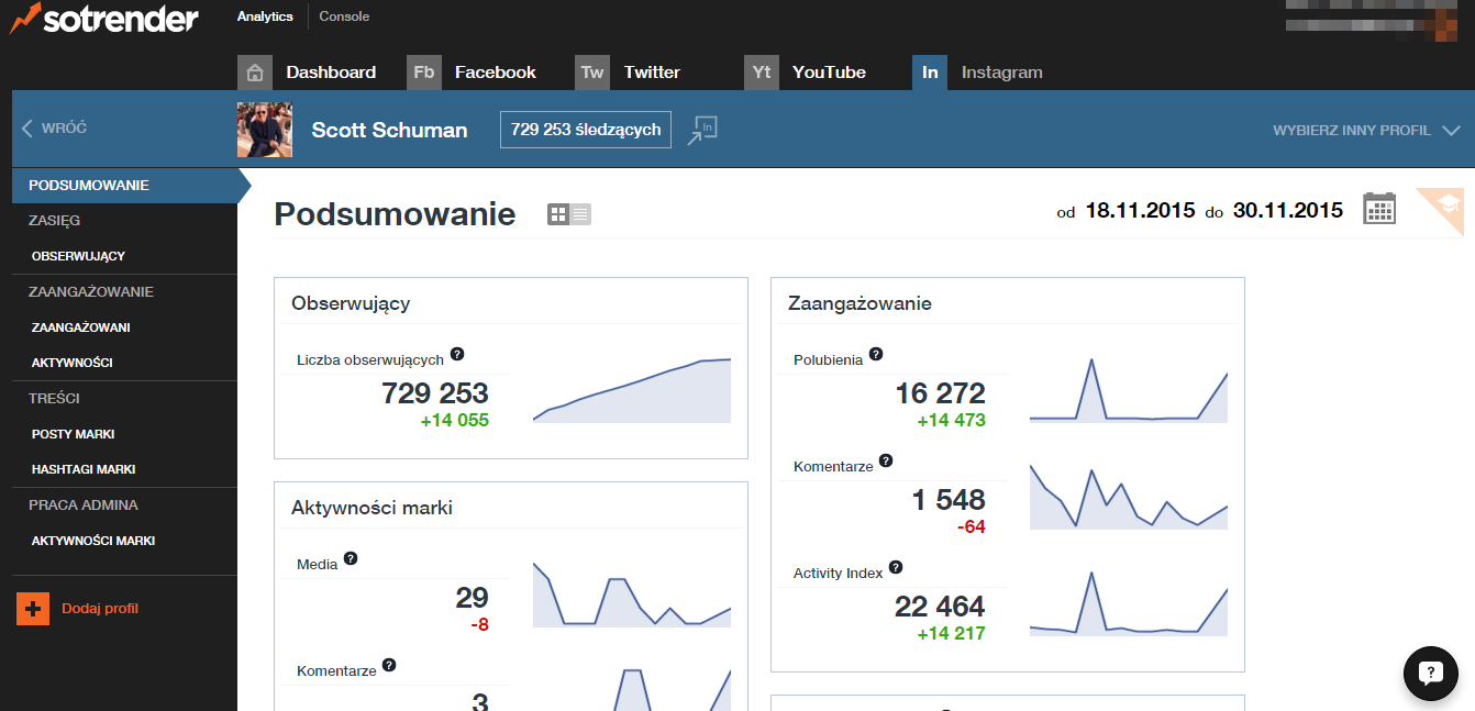 Komunikacja wizualna stale zyskuje na znaczeniu, a dla wielu marek Instagram staje się powoli drugim po Facebooku najpopularniejszym medium. Dlatego też Sotrender, oprócz analityki Facebooka, Twittera oraz YouTube, umożliwia obecnie również analizę wyników właśnie instagramowych profili.