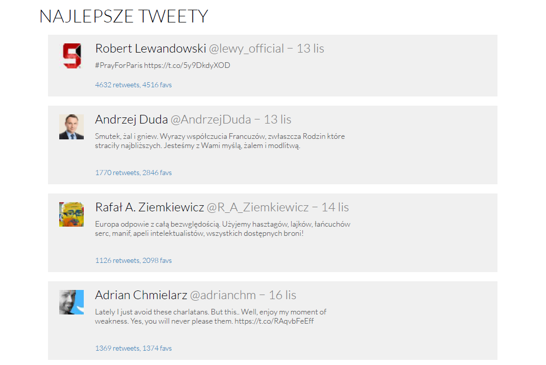 Można powiedzieć, że w listopadzie Twitter został niemalże ogłuszony echem zamachów terrorystycznych, które miały miejsce w Paryżu. Hashtag #ParisAttacks był trzecim najczęściej wykorzystywanym hashtagiem miesiąca, użytym ponad 1, 6 tys. razy. Użytkownicy Twittera w listopadzie ponad tysiąc razy użyli także hashtaga #PrayForParis. Również trzy najbardziej interaktywne wpisy miesiąca zawierały reakcję na przerażające doniesienia płynące z Francji. Statystyki wskazują niestety na niepokojący trend. Podczas, gdy różne hashtagi nawiązujące do tragedii, która rozegrała się w Paryżu w ciągu całego miesiąca zostały wykorzystane około 3 tys. razy, hashtag #1DPL, odwołujący się do koncertu zespołu One Direction tylko 17 listopada został dodany do blisko 6 tys. tweetów.