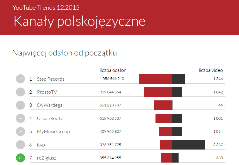 Najszybciej rosnącym kanałem pod koniec ubiegłego roku był rozrywkowy kanał Ponki. W grudniu zyskał ponad 54 tysiące nowych subskrybentów. Przełożyło się to na awans w ogólnych rankingach aktywności, interaktywności oraz liczby ocen filmów. Ponki awansował również w swojej podstawowej kategorii – rozrywkowych vlogów, a wszystko to dzięki filmowi “Czego nie mówić podczas rozmowy o pracę”.