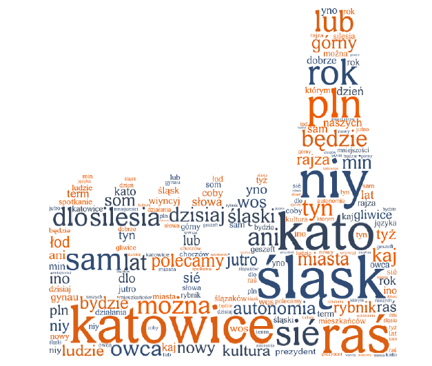 Sprawdziliśmy także jak wygląda sieć powiązań między użytkownikami zaangażowanymi na oficjalnych profilach śląskich miast oraz najczęściej używane słowa (polskie i śląskie) przez administratorów stron z kategorii Po śląsku oraz komentarze na tych stronach.