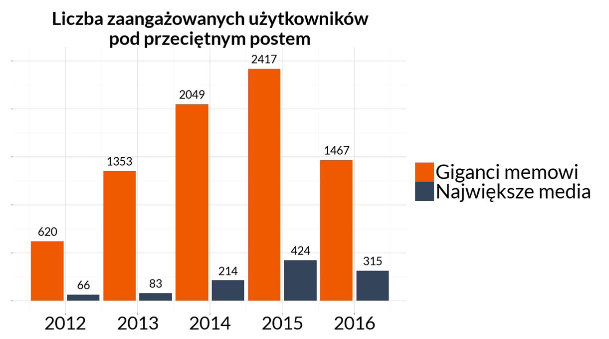 Liczba zaangażowanych użytkowników pod przeciętnym postem giganci memowi vs największe media