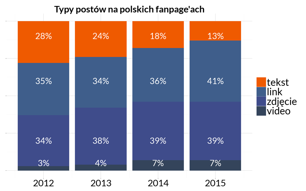 Znane i chyba zbyt często używane powiedzenie mówi, że jeden obraz jest wart tysiąca słów. Najbardziej angażujące treści w social media to obrazy. W 2011 roku 28% treści opublikowanych na polskich stronach na Facebooku było statusami tekstowymi, cztery lata później tylko 13%. Najpopularniejsze pozostały linki (które również przeważnie są zilustrowane zdjęciem) oraz zdjęcia. Razem odpowiadają za 80% komunikacji stron. Może jednak spadek ilościowy przełożył się na wzrost jakościowy? Dane temu przeczą, z każdym rokiem zmniejsza się przeciętna liczba znaków w statusach tekstowych. Piszemy rzadziej i coraz mniej.