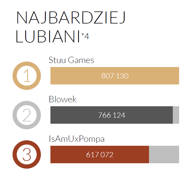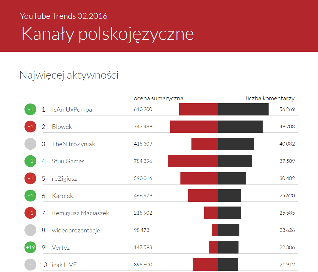 W pierwszym tygodniu marca w Katowicach odbyły się mistrzostwa świata w e-sporcie, Intel Extreme Masters, które przyciągnęły setki tysięcy widzów. Postanowiliśmy bliżej przyjrzeć się przedstawicielom tej dziedziny na polskim YouTube. W lutym najwięcej nowych subskrypcji zanotowały spośród kanałów polskojęzycznych StuuGames, Blowek i IsAmUxPompa. Te trzy kanały dostały również najwięcej kciuków w górę w ubiegłym miesiącu. Pierwsze dziesiątki rankingów aktywności i interaktywności kanałów w całości składają się z youtuberów gamingowych.