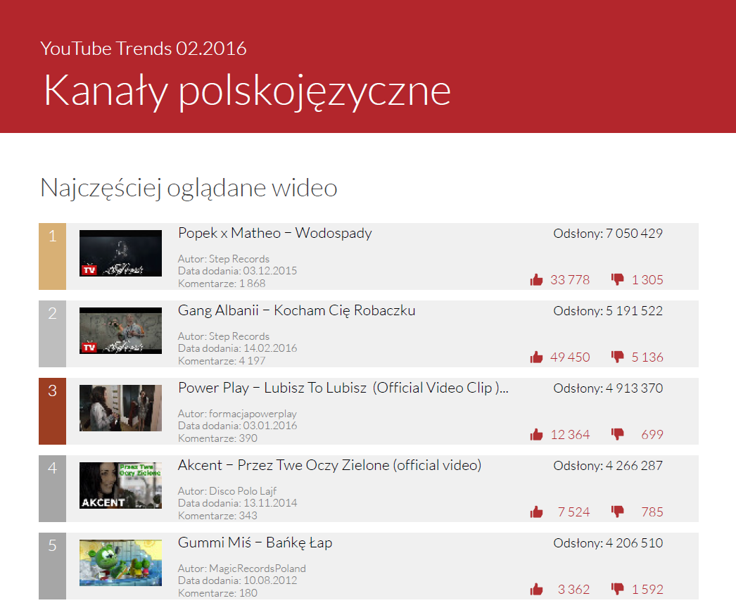 Mimo zdecydowanej dominacji youtuberów gamingowych w rankingach zaangażowania użytkowników, to muzyka jest najpopularniejszym rodzajem treści na YouTube. Podobnie jak przed miesiącem najchętniej oglądanym wideo był teledysk Popka i Matheo “Wodospady”, za którym znalazł się walentynkowy singel Gangu Albanii, “Kocham Cię, robaczku”. W pierwszej dziesiątce najchętniej oglądanych wideo znajdziemy jeszcze jeden singel Króla Albanii oraz trzy utwory disco polo. Ponownie w zestawieniu znalazły się trzy piosenki skierowane do dzieci, co może wynikać z ferii zimowych i większej ilości czasu spędzanej przez najmłodszych w internecie.