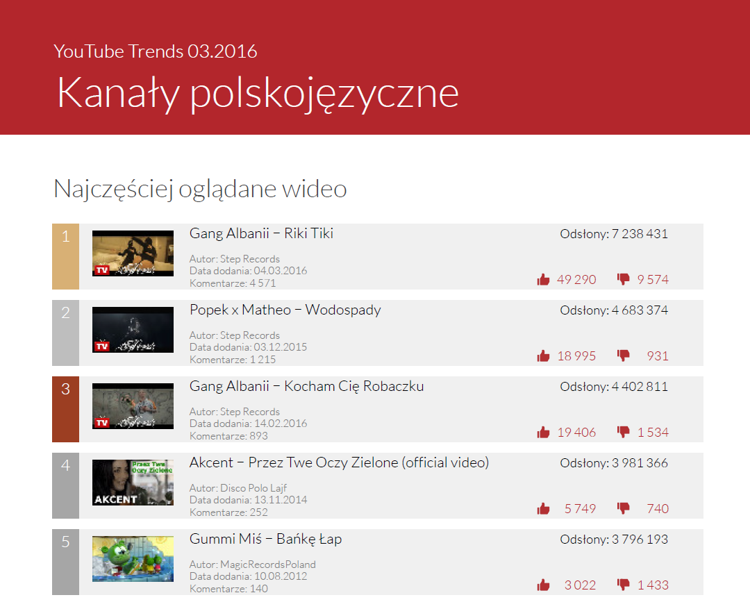 Nic nie zapowiada, by Popek miał przestać dominować na polskim YouTube. Nowy singel Gangu Albanii “Riki Tiki” stał się najpopularniejszym filmem marca, został wyświetlony ponad 7 milionów razy. Na dodatek w pierwszej trójce najchętniej oglądanych produkcji znalazły się jeszcze dwie pozycje z udziałem Pawła Raka. Czyżby na Popka naprawdę nie było mocnych?