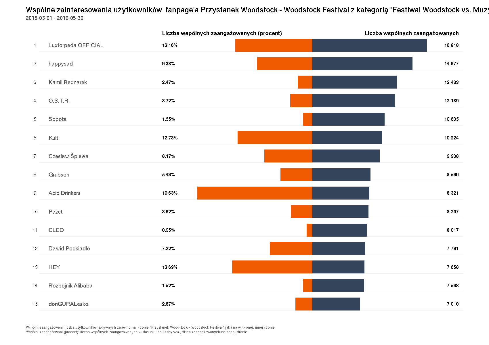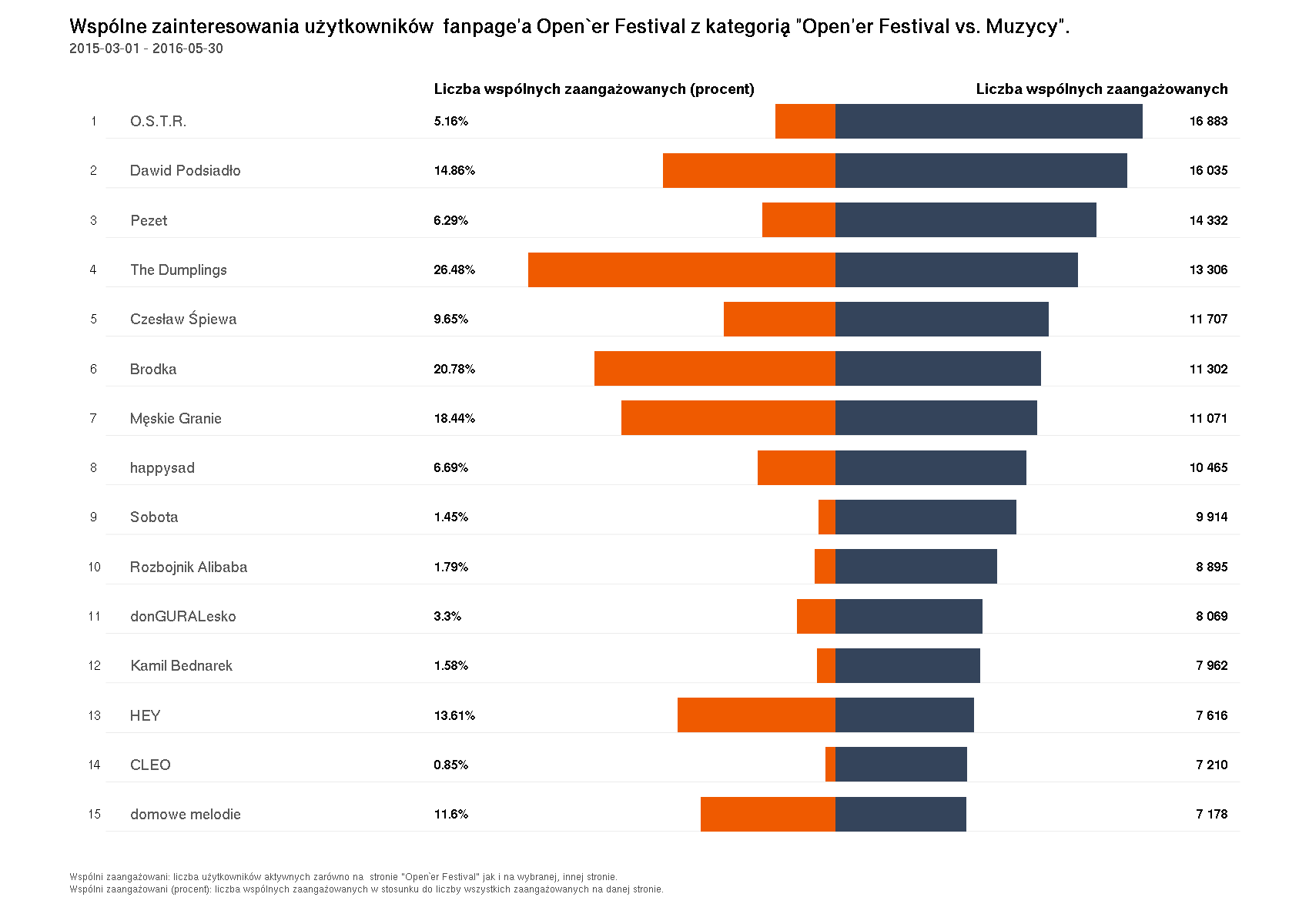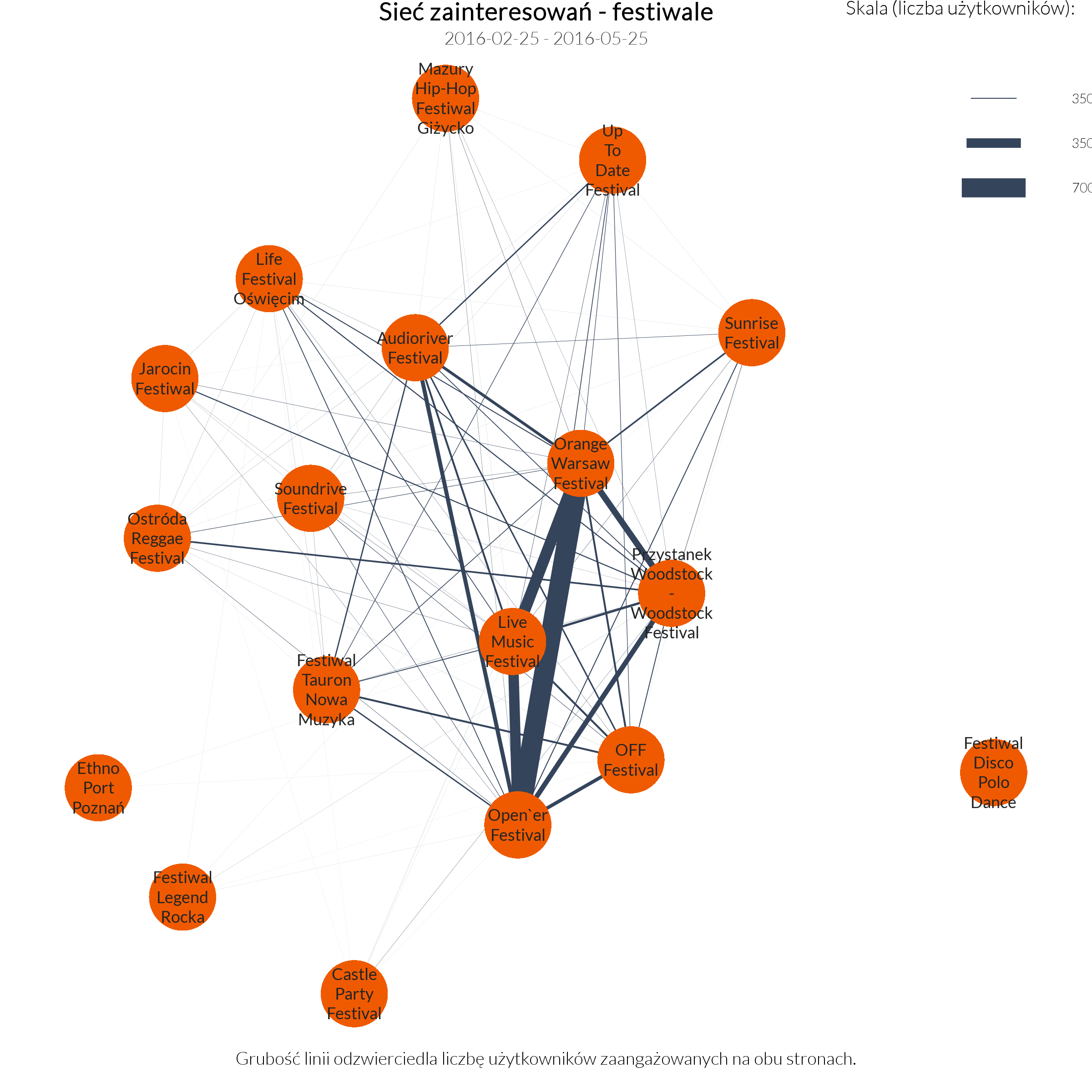 Woodstokowiczów łączą dość silne więzi z Jarocinem, Ostróda Reggae Festival, ale też OFF Festivalem. Z kolei, tak jak można było się spodziewać ci sami ludzie angażują się na stronie OFFa, Open’era i innego katowickiego festiwalu, Tauron Nowa Muzyka, który odbywa się pod koniec sierpnia. W sieci zainteresowań widać też wyraźnie, że festiwale mające bardzo silnie gatunkowo sprofilowane lineupy nie są blisko powiązanie z imprezami stawiającymi na muzyczną różnorodność. Folkowy Ethno Port, gotycki Castle Party czy Festiwal Legend Rocka, poświęcony muzyce sprzed czterech dekad mają bardzo małych wspólnych użytkowników z innymi badanymi festiwalami. Ewenementem jest Festiwal Disco Polo, którego użytkownicy nie angażują się na stronach żadnej z badanych imprez.