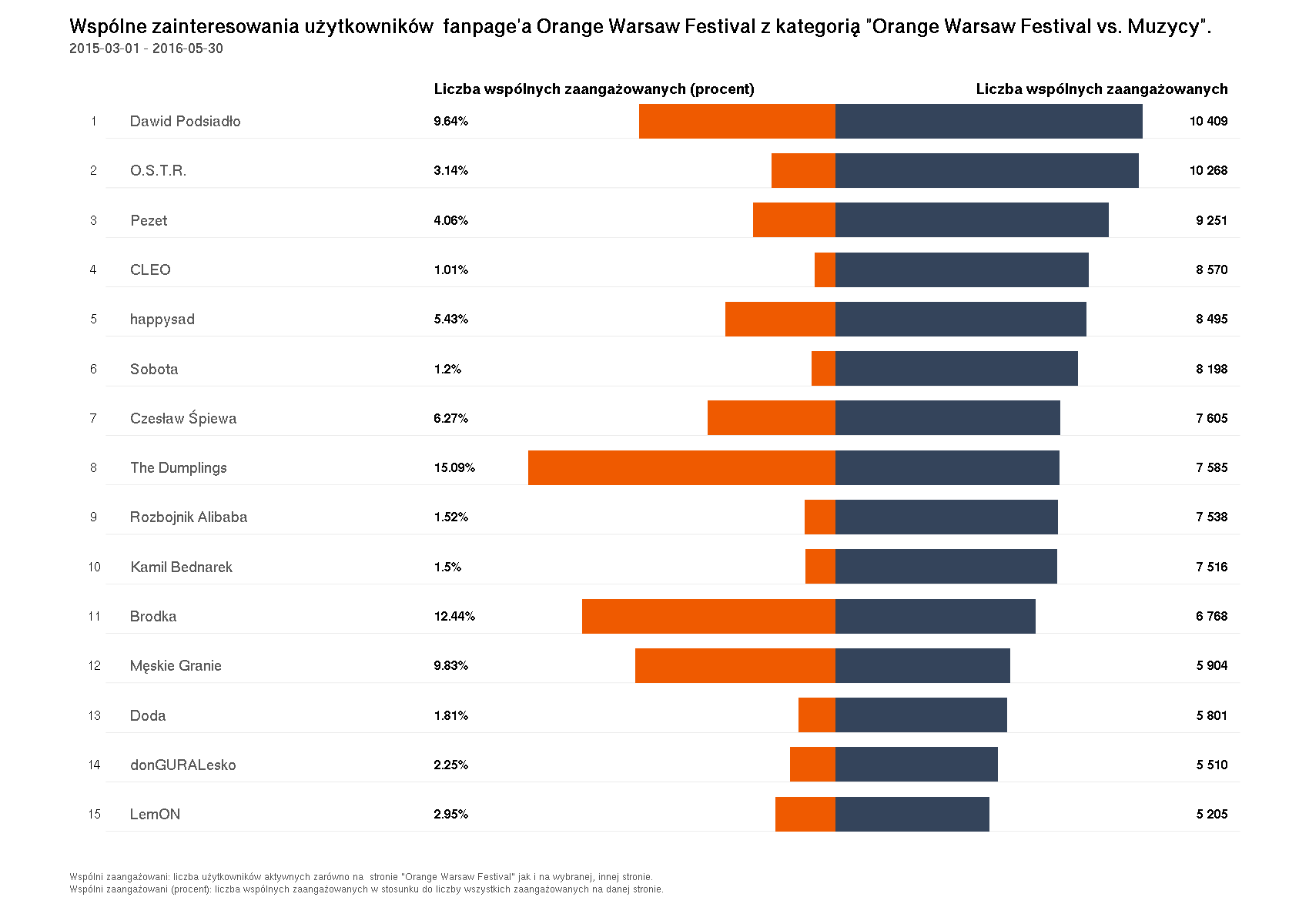 Inaczej wygląda sytuacja z Orange Warsaw Festivalem. Nikt z najpopularniejszych polskich artystów wśród użytkowników strony nie występuje w tym roku na festiwalu, ale kilkoro z nich znalazło się w poprzednich latach na scenach Open’era, a Brodka kilka lat temu grała na warszawskim festiwalu 6 lat temu. Najpopularniejszy wśród fanów Orange Warsaw Festival jest Dawid Podsiadło, ale jego będzie można zobaczyć w Gdyni.