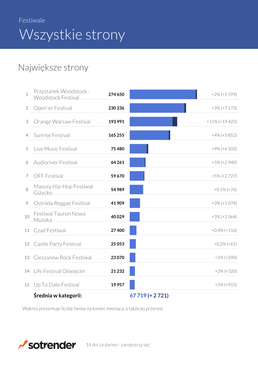 Zaczęliśmy od sprawdzenia, które polskie festiwale mają najwięcej fanów na Facebooku. W pierwszej piątce znalazły się Przystanek Woodstock, Open’er, Orange Warsaw, Sunrise Festival i Live Music Festival (który w tym roku wrócił po rocznej przerwie). To także największe festiwale pod względem liczby uczestników. Choć na Facebooku przewaga Woodstocku nad Open’erem to 44 tysiące fanów, na festiwal Jurka Owsiaka rokrocznie przyjeżdża około 500 tysięcy ludzi, a w Babich Dołach w ubiegłym roku bawiło się 90 tysięcy uczestników. Kołobrzeski Sunrise, poświęcony tanecznej muzyce elektronicznej na Facebooku lubi 165 tysięcy użytkowników, a zeszłoroczna edycja przyciągnęła ponad 100 tysięcy festiwalowiczów. Powyżej stu tysięcy fanów ma także Orange Warsaw Festival, odbywający się od kilku lat na warszawskim Służewcu.