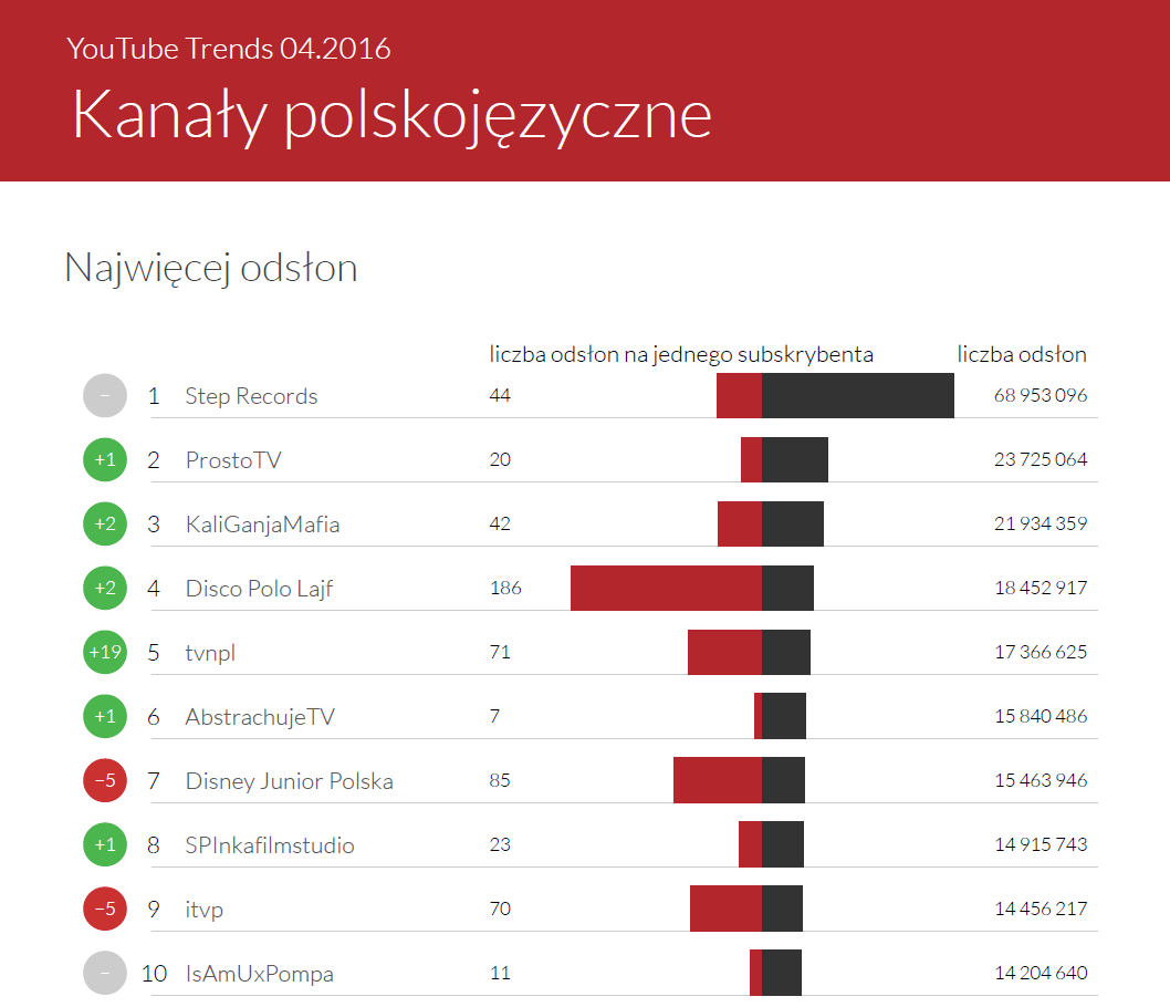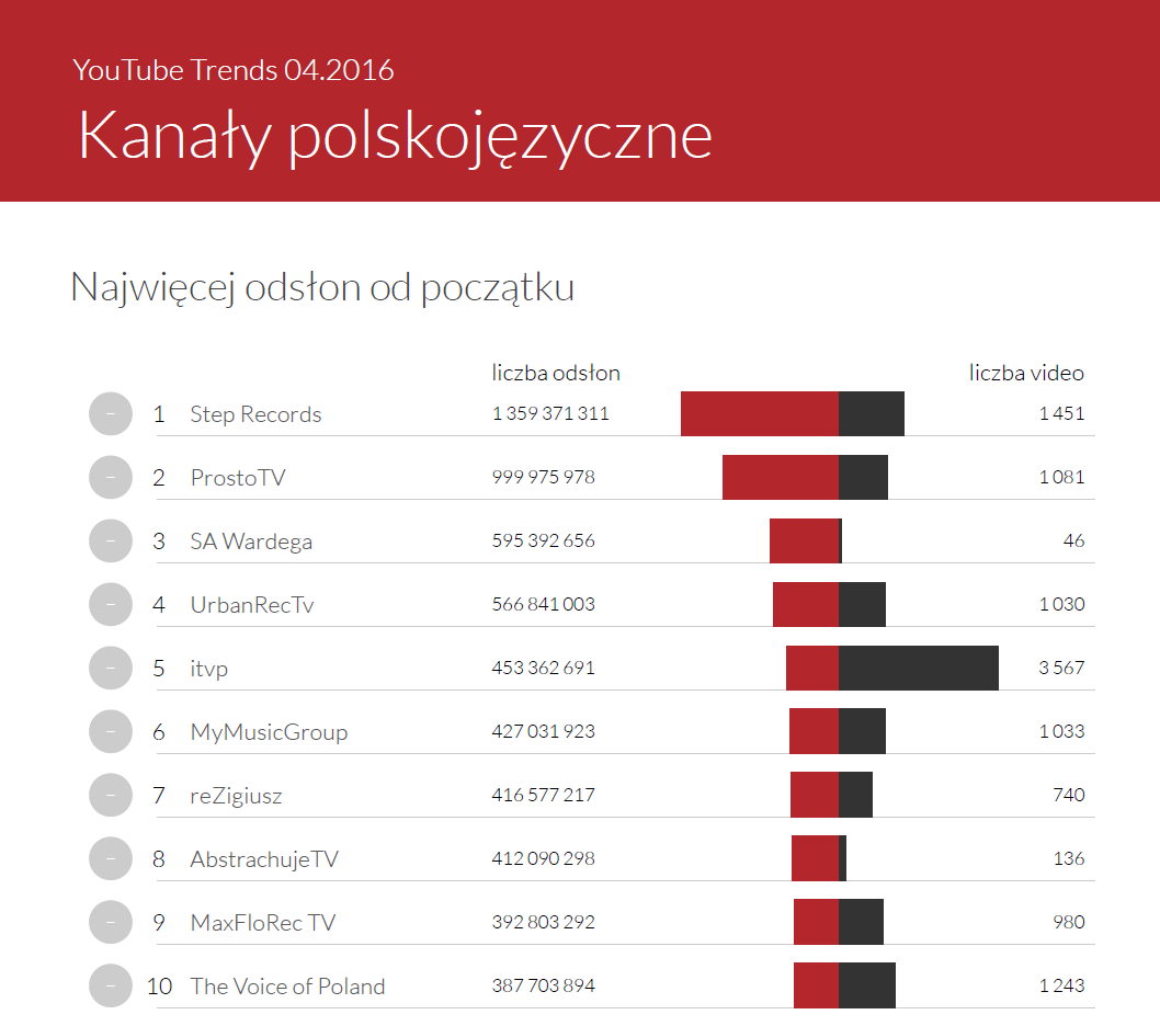W Prosto TV mogą już powoli chłodzić szampana. Kanał warszawskiej wytwórni hiphopowej kwiecień zakończył z liczbą 999 975 978 wyświetleń i pewnie zmierza po tytuł drugiego polskiego kanału, którzy przekroczy miliard wyświetleń. Przypomnijmy, że wcześniej udało się to Step Records, wytwórni odpowiedzialnej za sukces Gangu Albanii.