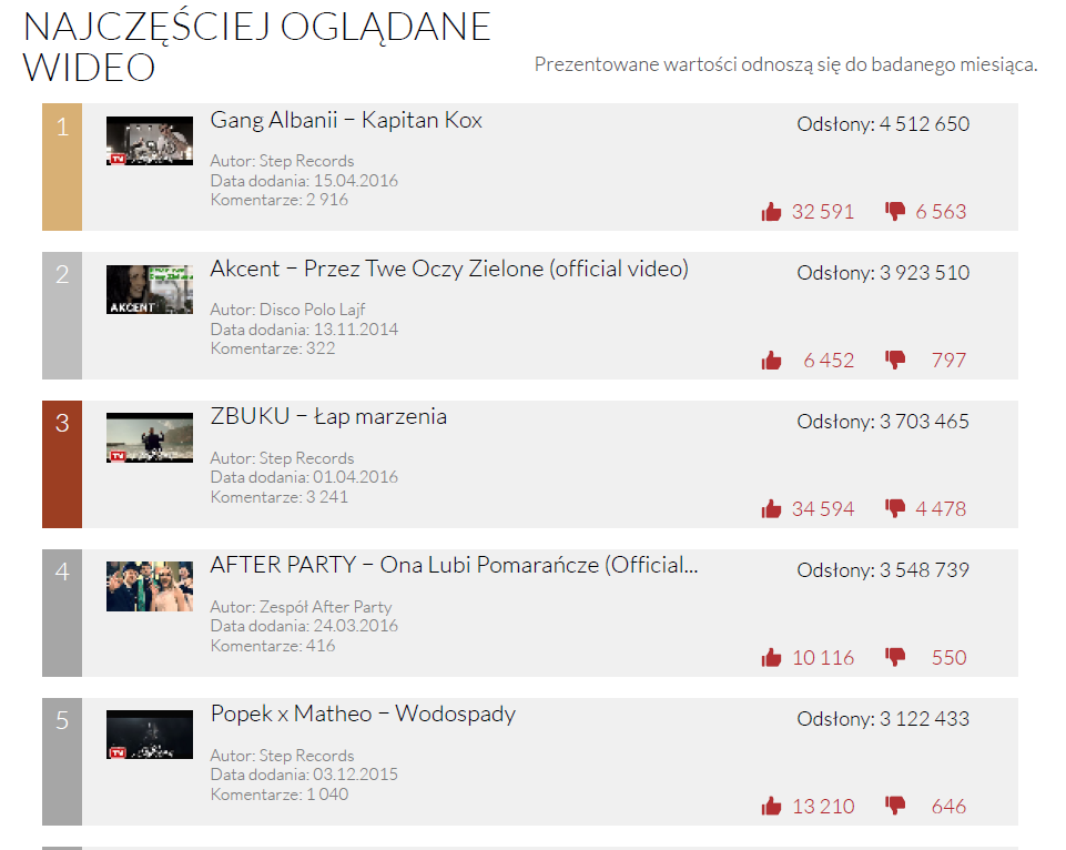 Kwiecień, podobnie jak marzec (i wiele poprzednich miesięcy) upłynął pod znakiem Gangu Albanii. Kolejny singel Popka, Borixona i Alibaby zadebiutował na pierwszym miejscu zestawienia najchętniej oglądanych filmów na polskim YouTube. Na pozostałych miejscach w pierwszej dziesiątce również spotkamy starych znajomych – Akcent i After Party, Gummi Misia – i jedną nowość, piosenkę Zbuka, wydaną przez (cóż za zaskoczenie) Step Records.
