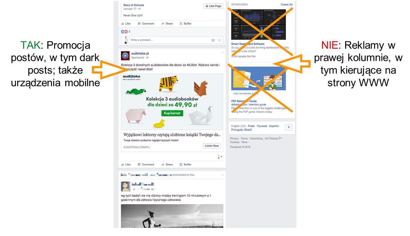 W tych analizach skupiamy się na komunikacji profili widocznej w newsfeedzie użytkowników, uwzględniając zarówno posty widoczne na ścianie profilu, jak i tzw. dark posty. Są to formy reklamowe specyficzne dla Facebooka i pozwalające na interakcje z treścią. Nie bierzemy natomiast pod uwagę tak zwanych reklam w prawej kolumnie, które zwykle są kolejną formą reklamy display i często kierują na strony WWW, czyli poza Facebooka.