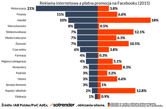 Liderem wydatków na płatną komunikację na Facebooku jest handel. W tej kategorii zawiera się także e-commerce, który odpowiada za prawie 50% wydatków branży. W 2015 roku na sponsorowane posty (w tym dark posty) marki z tej kategorii wydały łącznie ponad 50 milionów złotych. Coraz więcej decyzji zakupowych (i samych zakupów) odbywa się online, z uwzględnieniem social media, dlatego takie wydatki nie są zaskoczeniem. Wysoką pozycję zajmuje kategoria Napoje i alkohole. Marki piwa, cydru i mocniejszych alkoholi odpowiadały za ponad połowę kosztów reklamy w tej branży, wykorzystując sytuację mniejszych regulacji reklamy w tym kanale. Nie zaskakują niskie wydatki reklamowe firm farmaceutycznych (ponad 50 razy mniej niż handel), ponieważ ta branża skupia się przede wszystkim na reklamie w mediach tradycyjnych, a poza tym ograniczenia prawne utrudniają jej promocję w mediach społecznościowych.
