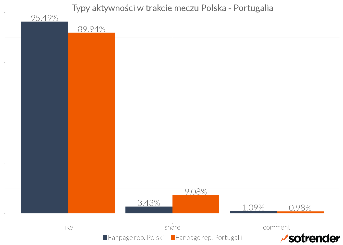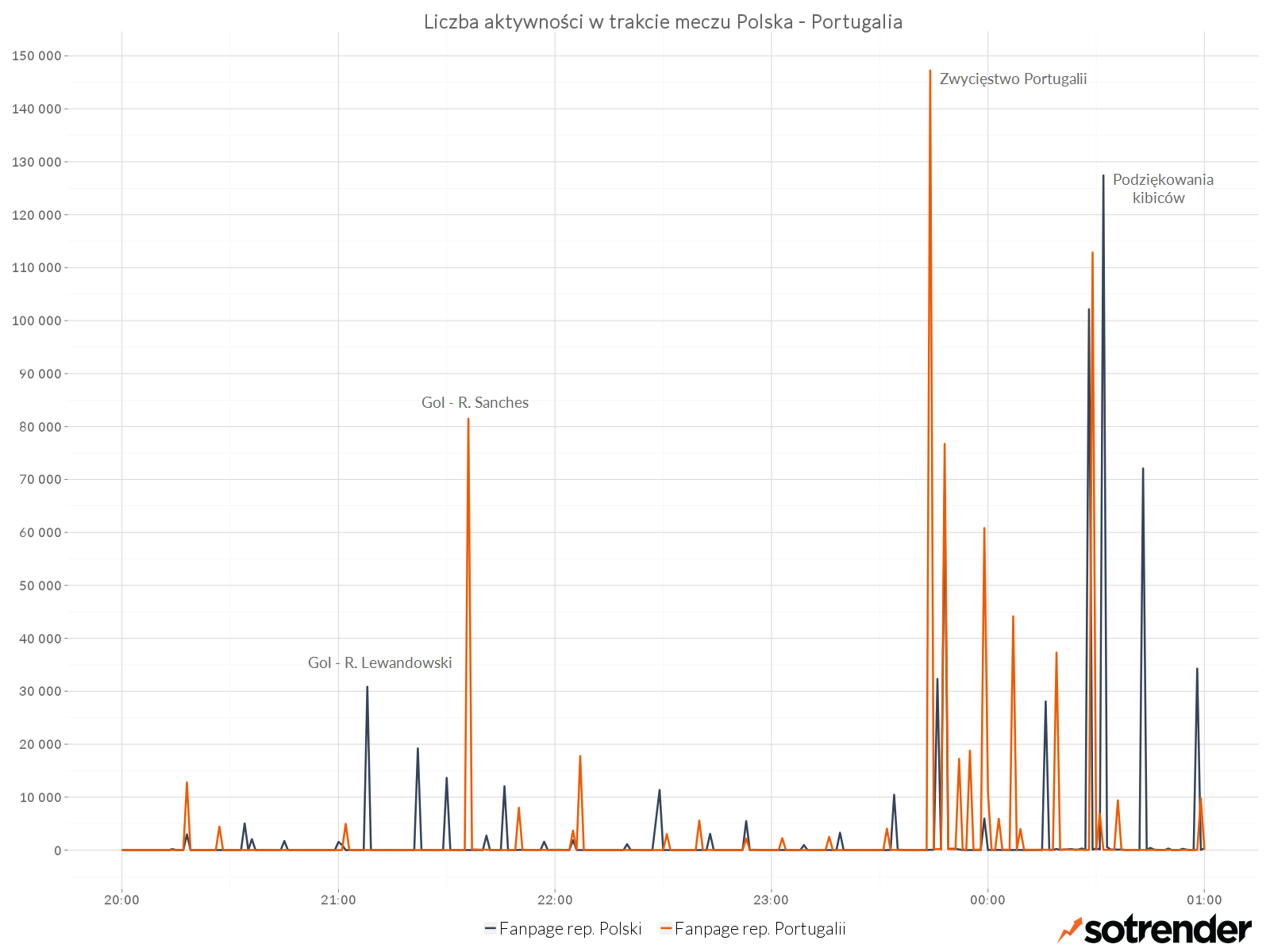Oficjalne profile kibicowskie na Facebooku między 20:00 30.06 a 01:00 1.07 zamieściły w sumie 66 (w tym 37 Portugalczycy) postów a te wywołało reakcję w postaci 17 688 komentarzy. Jako naród, który zawsze ma coś do powiedzenia, zamieściliśmy ich na Łączy Nas Piłka aż o 1 300 więcej niż kibice rywali. Natomiast aktywności (polubień, udostępnień, komentarzy) pod profilami było aż 1, 5 miliona.