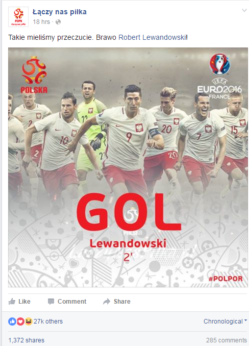 Post profilu Łączy nas piłka o golu Lewandowskiego zgromadził ponad 290 komentarzy, 1 370 udostępnień i około 27 tys. różnych reakcji.