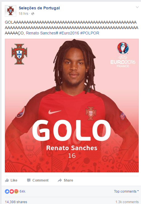 Natomiast post o golu Sanchesa z profilu Seleções de Portugal – ponad 1 400 komentarzy, 14 300 udostępnień i 64 tys. reakcji, w tym 199 “złości” (możecie się domyślać, kto najczęściej dodawał taką reakcję).