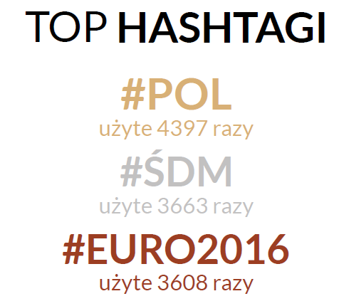 Najczęściej używane hashtagi w lipcu to #POL, #ŚDM i #EURO2016. Jak widać, nasz lokalny hashtag światowych Dni Młodzieży okazał się dużo popularniejszy od oficjanego #WYD. Do #ŚDM należała oczywiście końcówka miesiąca – od 26 do 31 lipca to właśnie był najpopularniejszy hashtag dnia. Reszta miesiąca upłynęła przede wszystkim pod znakiem wydarzeń sportowych – fazy finałowej francuskiego turnieju, Tour de Pologne, Final Six siatkarskiej Ligi Światowe – a także wydarzeń politycznych – szczytu NATO, próby zamachu stanu w Turcji oraz tragicznych wydarzeń w Niemczech.