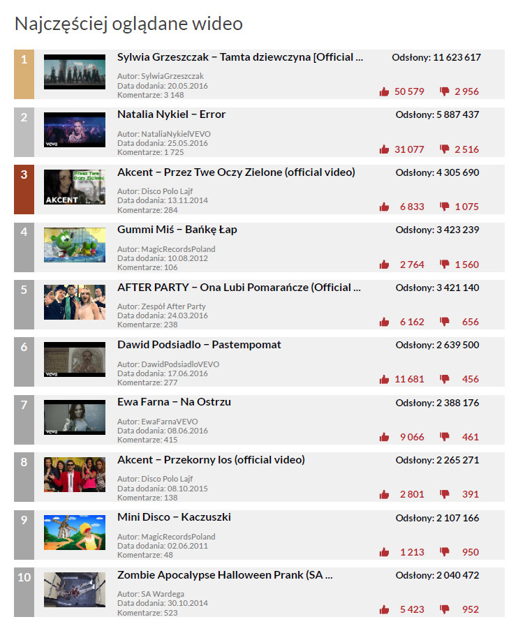 Chyba musimy zacząć przyzwyczajać się do myśli, że produkcji Popka i Gangu Albanii brakuje wśród najchętniej oglądanych wideo miesiąca. W lipcu wypadli nawet z pierwszej dziesiątki. Co ciekawe, nie znalazł się w niej także żaden film opublikowany w ubiegłym miesiącu. Polacy najchętniej oglądali teledyski Sylwii Grzeszczak, Natalii Nykiel i Akcentu, czyli czołówka najpopularniejszych wideo nie zmieniła się w stosunku do czerwca.
