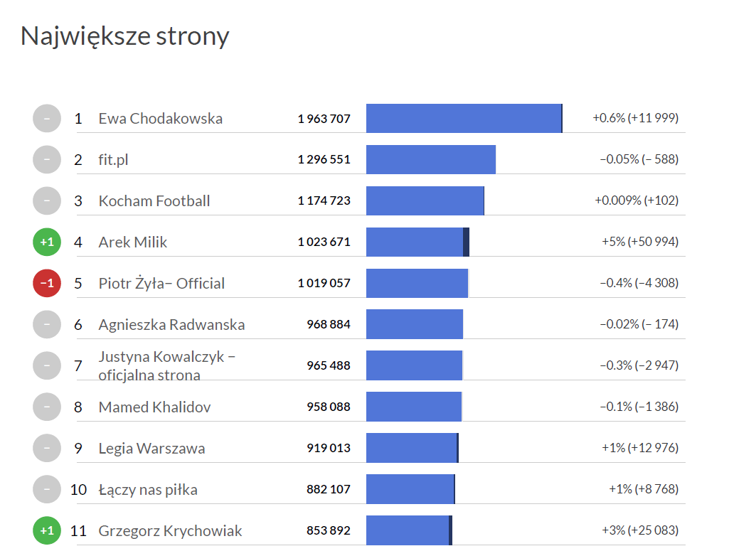 Czerwiec i lipiec upłynęły pod znakiem EURO 2016, sierpień natomiast zdominowały letnie Igrzyska Olimpijskie w Rio de Janeiro. Choć na Facebooku hashtagi nie są podstawową częścią komunikacji (inaczej niż na Twitterze), warto zauważyć, że najpopularniejsze w sierpniu były te związane z RIO 2016. Jednak, kiedy przyjrzymy się dokładniej kategorii sport, widać coś innego – efekt transferów polskich piłkarzy do nowych klubów. Arek Milik trafił do Napoli i przybyło mu pięćdziesiąt tysięcy nowych fanów, lipcowa przeprowadzka Grzegorza Krychowiaka do Paris Saint-Germain sprawiła, że jego stronie na Facebooku przybyło 25 tysięcy fanów. Awans Legii Warszawa do Ligi Mistrzów sprawił, że awansowała w rankingach zaangażowania i interaktywności odpowiednio o 9 i 11 miejsc w kategorii Sport. W rankingu klubów piłkarskich Legii wiedzie się dużo lepiej niż na boiskach Ekstraklasy na początku obecnego sezonu – niezagrożona jest najpopularniejszym polskim klubem na Facebooku i pewnie idzie po milion fanów.