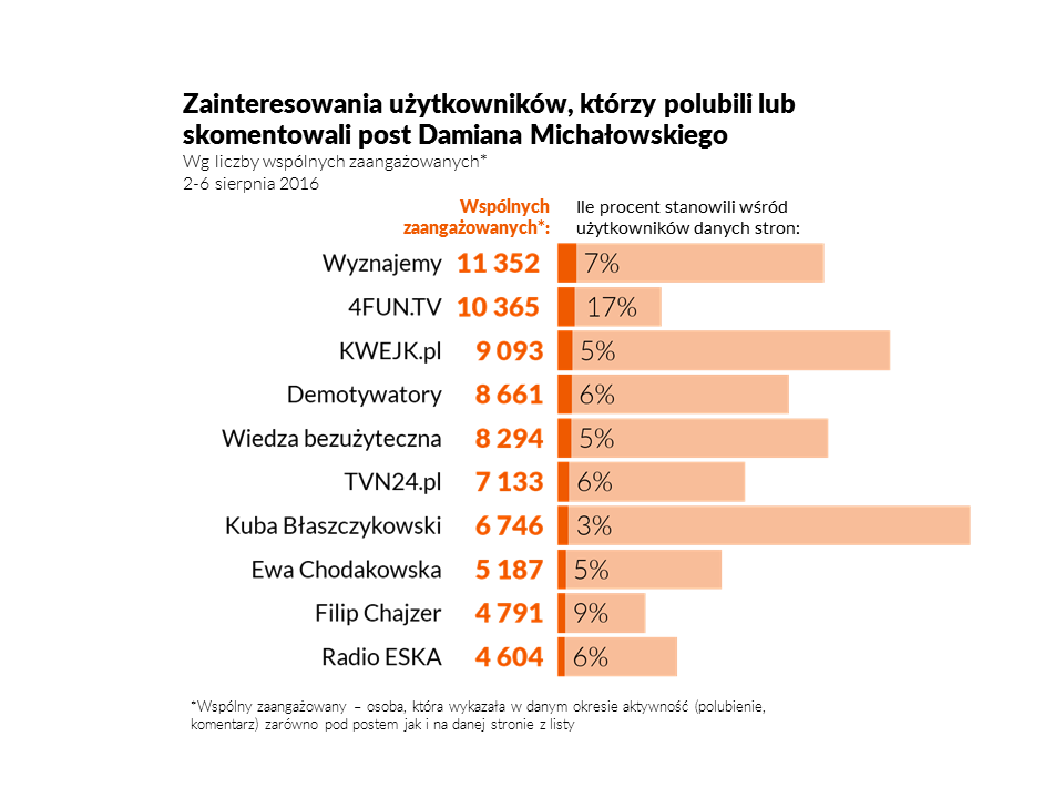 Zainteresowania użytkowników, którzy polubili lub skomentowali post Damiana Michałowskiego (wg procenta wspólnych zaangażowanych)