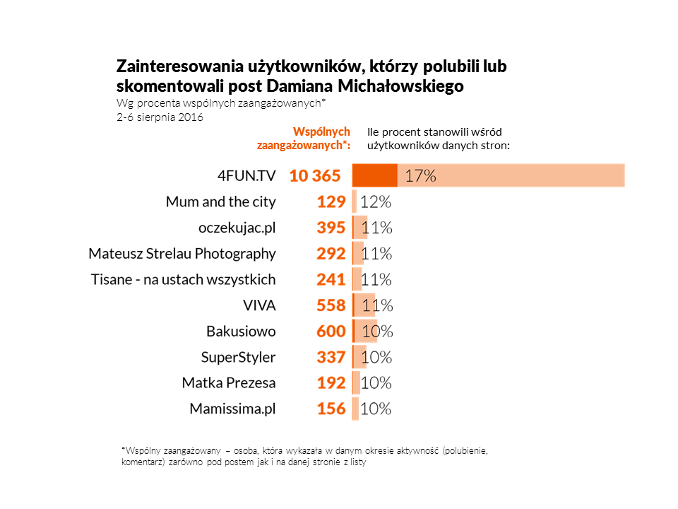Zbadaliśmy, skąd przyszli użytkownicy reagujący na rekordowy post (dowiedz się więcej o naszej metodzie badawczej). Aż 10 tysięcy osób, które weszły w interakcję z postem Damiana to fani strony 4fun.tv. To 17% wszystkich komentujących i lajkujących zdjęcie dziennikarza. 4fun udostępnił post dopiero następnego dnia, a on sam już wcześniej rozchodził się wiralowo. Duży odsetek wspólnych zaangażowanych (10 % i więcej) widać ze stronami poświęconymi rodzicielstwu – Mum and the City, oczekujac.pl, Mamissima i Bakusiowo.