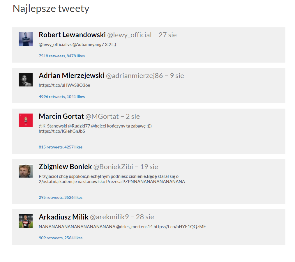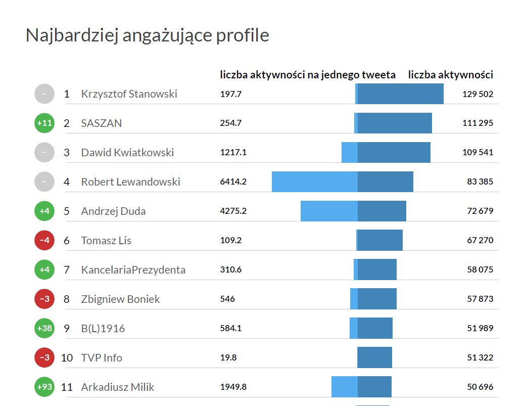 Poza Marcinem Gortatem, najbardziej angażujące tweety wysłali jak zawsze Robert Lewandowski, Arkadiusz Milik, Zbigniew Boniek oraz Adrian Mierzejewski. Ten ostatni pochwalił się przejściem do nowego klubu. Profil Roberta Lewandowskiego kolejny miesiąc z rzędu najszybciej zdobywał nowych obserwujących, przed polskim kontem Papieża Franciszka oraz Zbigniewem Bońkiem. Natomiast najbardziej angażującym profilem był profil Krzysztofa Stanowskiego przed Saszan oraz Dawidem Kwiatkowskim. Największy awans w rankingu zaangażowania odnotował profil Arka MIlika, który awansował o 93 miejsca.
