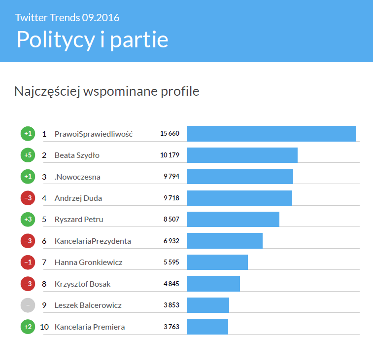 Tak, jak pisaliśmy, wrzesień przyniósł dużo politycznych emocji. Widać to wyraźnie w rankingu najbardziej angażujących profili. Choć najlepiej swoją społeczność aktywizuje Dawid Kwiatkowski, to w górę poszły prawie wszystkie profile polityczne. Największy awans zanotował profil Prawa i Sprawiedliwości – o 13 miejsc w zestawieniu wszystkich profili polskojęzycznych. Natomiast najczęściej wspominane profile polityczne to konta Prawa i Sprawiedliwości, Beaty Szydło oraz .Nowoczesnej.