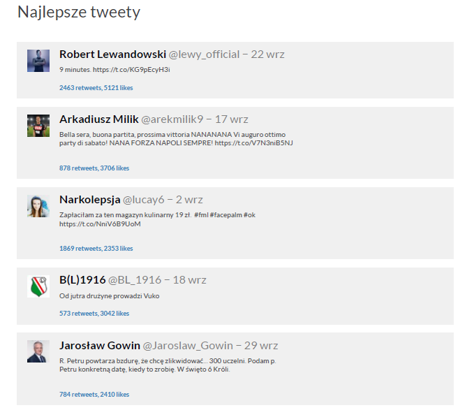 Zapowiadane niespodzianki wśród najpopularniejszych tweetów miesiąca to tweety Narkolepsji, Bogusława Leśnodorskiego i Jarosława Gowina. Każdy z nich jest związany z kontrowersją. Blogerka Narkolepsja skarży się na zawartość pewnego czasopisma kulinarnego, prezes Legii ogłasza tymczasowego trenera klubu (i jednocześnie zwolnienie dotychczasowego, Albańczyka Besniego Hasi), a minister nauki i szkolnictwa wyższego wytyka błąd liderowi Nowoczesnej. Robert Lewandowski przypomniał swój nieprawdopodobny występ sprzed roku, gdy strzelił 5 goli w 9 minut, a Arek Milik świętował kolejne zwycięstwo SSC Napoli.